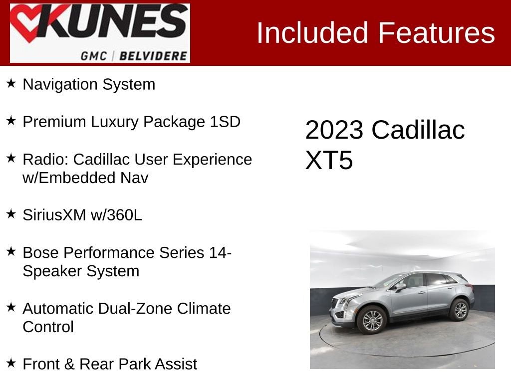 Certified. 2023 Cadillac XT5 Premium Luxury Premium Luxury Automatic Dual-Zone Climate Control, Automatic Emergency Braking, Bose Performance Series 14-Speaker System, Dual Driver Info Center Display Gauge Cluster, Front & Rear Park Assist, HD Rear Vision Camera, Inside Rear-View Auto-Dimming Mirror, Navigation System, Premium Luxury Package 1SD, Radio: Cadillac User Experience w/Embedded Nav, SiriusXM w/360L, Teen Driver, Wireless Apple CarPlay/Wireless Android Auto. Argent Silver MetallicOpened with Kunes in June 2020 along with Kunes CDJR of Belvidere, Kunes Cadillac GMC of Belvidere allows us to have another location close to home for you to find your ideal Cadillac or GMC vehicle. Being so close to Rockford, IL means that we are at a convenient location for many Illinois as well as Wisconsin residents. Previously Kunes Country, Kunes Auto Group has stayed true to our values with our slogan of Faith, Family, and Giving Back. These four words embody what Kunes Auto Group is all about. We strive to build people's lives and we live up to that by employing over 2,000 people and donating 10% of our yearly net profits to charities in our communities. Our dedication to our employees, customers, and communities is shown through our countless Automotive Newsâ Best Dealerships to Work For awards that are given to 100 dealers nationwide every year. Certification Program Details:** NO FEAR LIFETIME CERTIFIED PREOWNED **Over $2,895 of value at no cost!*LIFETIME WARRANTY!*3 Day Exchange Policy!*Complimentary powertrain warranty with ability to upgrade to fully comprehensive coverage and/or extend up to 125,000 miles!*125+ Point Inspection by our factory trained ASE Certified technicians and reconditioned to the highest standards.*Complimentary AutoCheck History Report*Complimentary AutoCheck Buyback Protection*Financing for Everyone - Guaranteed credit approval regardless of credit history!*Over 30 lenders who compete to get you the best financing terms*No payments for up to 90 days!*Weekly, Bi-Weekly, and Monthly Payment Options for all buyers!*First Free Oil Change!*Trade anytime policy - cars, trucks, boats, RVs, motorcycles - as long as we donât have to feed it, you can trade it! While we make every effort to ensure the data listed here is correct, there may be instances where some of the options or vehicle features may be listed incorrectly as we get data from multiple data sources. PLEASE MAKE SURE to confirm the details of this vehicle with the dealer to ensure its accuracy. Dealer cannot be held liable for data that is listed incorrectly. Prices shown do not include taxes, license, and title fees and a $367.70 documentary service fee.