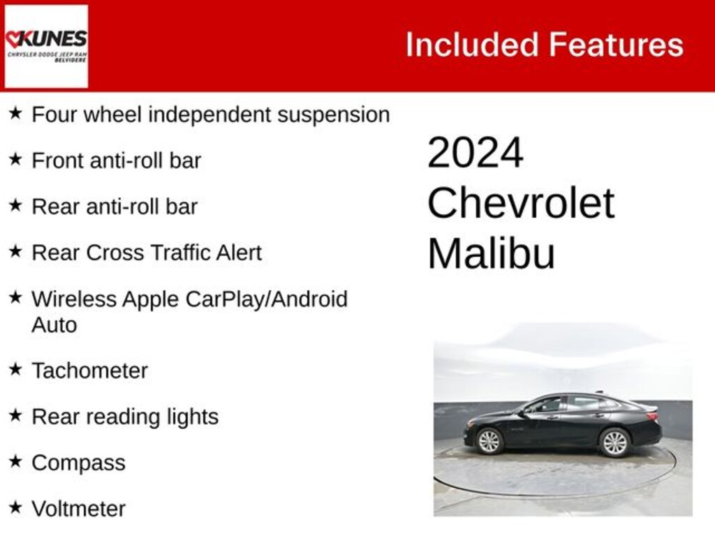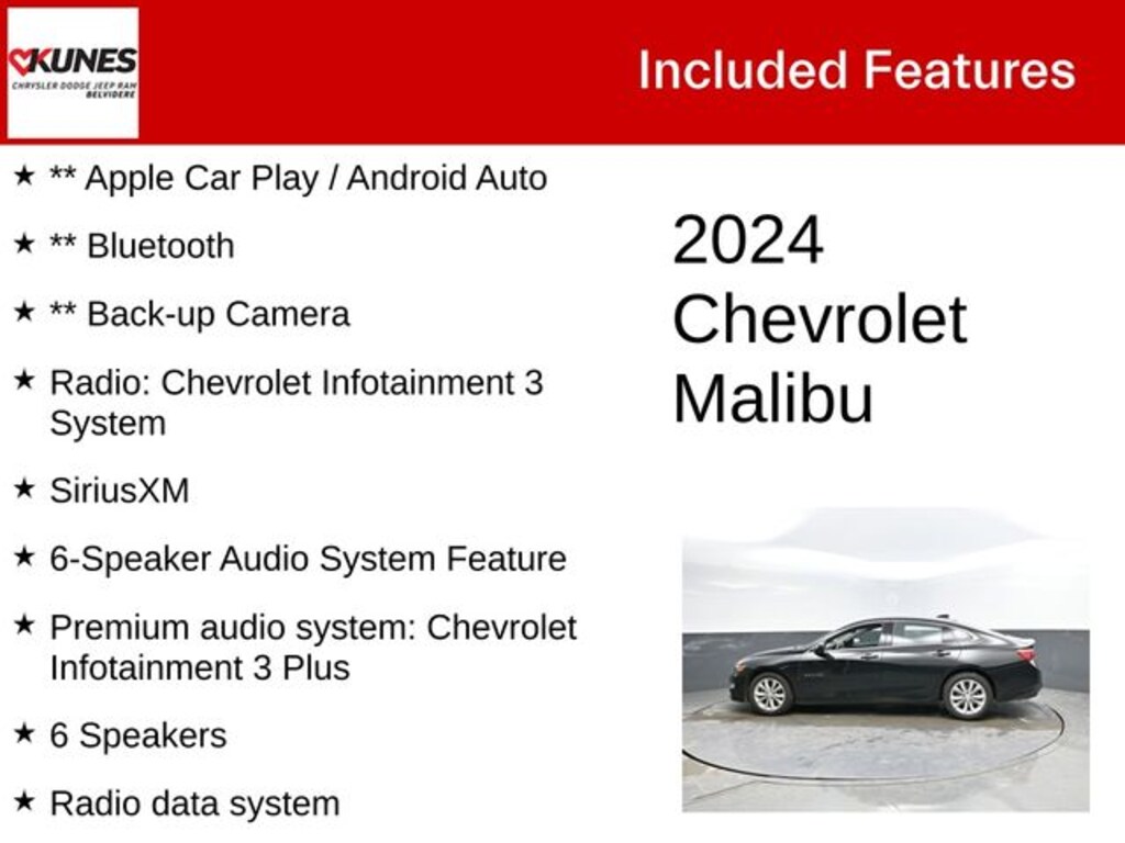 2024 Chevrolet Malibu LT 1LT 1LT FWD ** Apple Car Play / Android Auto, ** Bluetooth, ** Back-up Camera, 6 Speakers, 6-Speaker Audio System Feature, Compass, Four wheel independent suspension, Front anti-roll bar, Front Center Armrest, Premium audio system: Chevrolet Infotainment 3 Plus, Radio data system, Radio: Chevrolet Infotainment 3 System, Rear anti-roll bar, Rear Cross Traffic Alert, Rear reading lights, SiriusXM, Split folding rear seat, Tachometer, Voltmeter, Wireless Apple CarPlay/Android Auto.