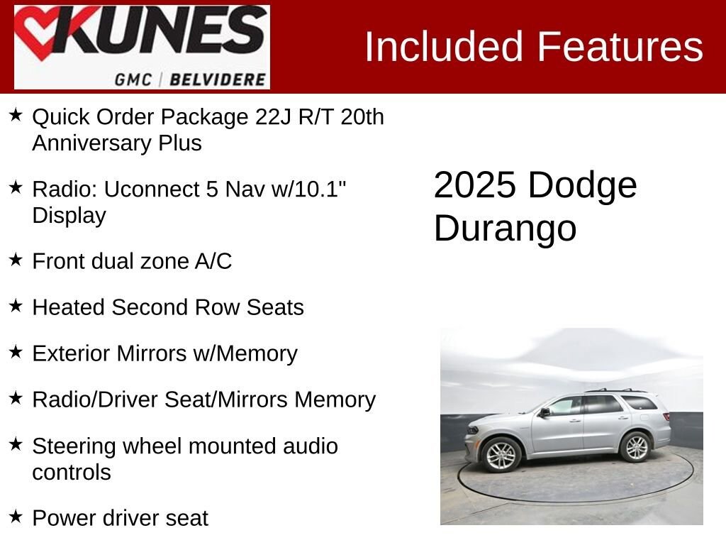 Recent Arrival! Certified. 2025 Dodge Durango R/T Plus R/T Plus 115V Auxiliary Power Outlet, 2nd Row Seat Mounted Inboard Armrests, 6-Passenger Seating, 7 & 4 Pin Wiring Harness, Adaptive Cruise Control w/Stop, Auto-Dimming Exterior Driver Mirror, Auto-leveling suspension, Black Roof Rails, Blind Spot w/Trailer Detection, Bumpers: body-color, Class IV Receiver Hitch, Cloth Bucket Seats w/Shift Insert, Delay-off headlights, Dual Remote USB Port - Charge Only, Emergency communication system: Dodge Connect, Exterior Mirrors w/Heating Element, Exterior Mirrors w/Memory, Exterior Mirrors w/Supplemental Signals, Floor Console w/Leather Armrest, Four wheel independent suspension, Front Center Armrest w/Storage, Front dual zone A/C, Full Speed Forward Collision Warning Plus, Gloss Black Exterior Mirrors, Heated Second Row Seats, Illuminated entry, Integrated Roof Rail Crossbars, Leather Trimmed Bucket Seats, Leather Wrapped Door Panels, LED Auxiliary Low Beam & Turn Signal, Occupant sensing airbag, Outside temperature display, Overhead airbag, Panic alarm, Power 6x9 Multi-Function Foldaway Mirrors, Power 8-Way Driver Memory 8-Way Passenger Seats, Power door mirrors, Power driver seat, Power Driver/Passenger 4-Way Lumbar Adjust, Power Tilt & Telescopic Steering Column, Premium Instrument Panel, Quick Order Package 22J R/T 20th Anniversary Plus, Radio: Uconnect 5 Nav w/10.1 Display, Radio/Driver Seat/Mirrors Memory, Rear Load Leveling Suspension, Rear reading lights, Rear seat center armrest, Red Accent Stitching, Speed-Sensitive Wipers, Split folding rear seat, Steering wheel mounted audio controls, Tachometer, Telescoping steering wheel, Trailer Brake Control, Ventilated Front Seats, Voltmeter, Wheels: 20 x 10 Forged Y-Spoke Brass Monkey, Wheels: 20 x 8.0 Fine Silver. Triple Nickel