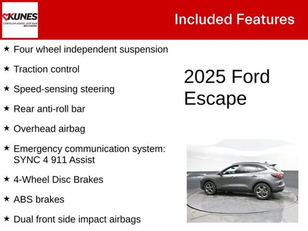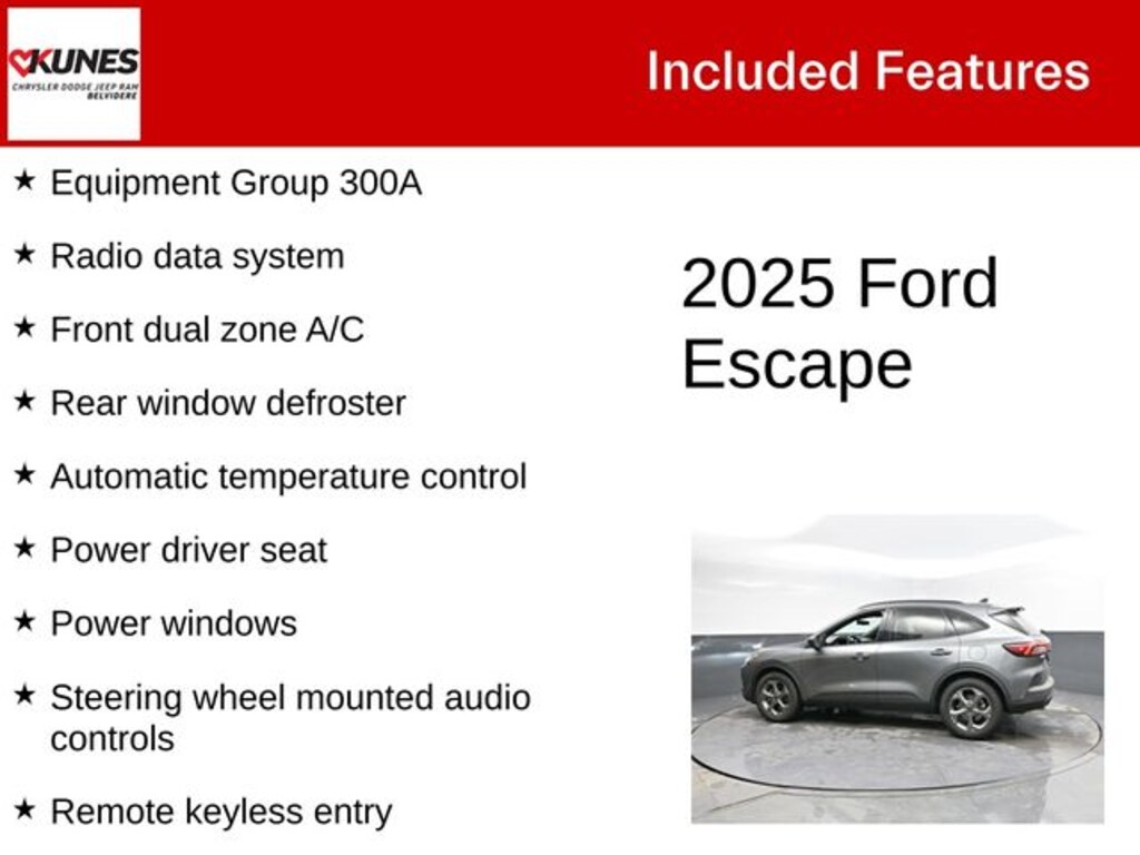 Recent Arrival! Certified. 2025 Ford Escape ST-Line FWD Escape ST-Line, 1.5L EcoBoost, 8-Speed Automatic, Ebony w/Vinyl/Cloth Front Sport Contour Bucket Seats, 3.81 Axle Ratio, 4-Wheel Disc Brakes, ABS brakes, Auto High-beam Headlights, Automatic temperature control, Compass, Delay-off headlights, Driver door bin, Driver vanity mirror, Dual front side impact airbags, Electronic Stability Control, Emergency communication system: SYNC 4 911 Assist, Equipment Group 300A, Four wheel independent suspension, Front anti-roll bar, Front Bucket Seats, Front Center Armrest, Front dual zone A/C, Front reading lights, Illuminated entry, Internet access capable: FordPass Connect 4G, Knee airbag, Occupant sensing airbag, Outside temperature display, Overhead airbag, Overhead console, Panic alarm, Passenger door bin, Passenger vanity mirror, Power door mirrors, Power driver seat, Power windows, Radio data system, Rear anti-roll bar, Rear reading lights, Rear seat center armrest, Rear window defroster, Remote keyless entry, Speed control, Speed-sensing steering, Speed-Sensitive Wipers, Split folding rear seat, Sport steering wheel, Steering wheel mounted audio controls, Tachometer, Telescoping steering wheel, Tilt steering wheel, Traction control, Variably intermittent wipers, Vinyl/Cloth Front Sport Contour Bucket Seats.