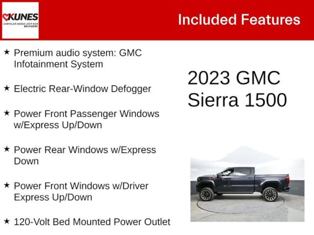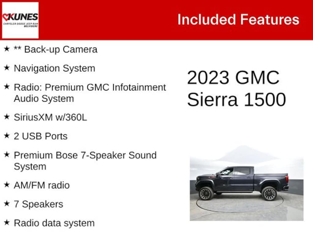 While we make every effort to ensure the data listed here is correct, there may be instances where some of the factory rebates, incentives, options or vehicle features may be listed incorrectly as we get data from multiple data sources. PLEASE MAKE SURE to confirm the details of this vehicle with the dealer to ensure its accuracy. Dealer cannot be held liable for data that is listed incorrectly. * MSRP is the Manufacturer's Suggested Retail Price (MSRP) of the vehicle. It does not include any tax, title, license or $377.63 documentary service fee. Consult the dealer for fees, payments and complete details. * Offers, incentives, discounts, or financing are subject to expiration and other restrictions. See dealer for qualifications and complete details. * In transit means that vehicles have been built but have not yet arrived at our dealership; images shown may not necessarily represent exact vehicles in transit to your dealership. See your dealer for complete details. Consumers, please be aware that the above advertised price assumes you are purchasing the vehicle from the Kunes Auto Group dealership where it is listed as being offered for sale. If the vehicle is transferred from one location to another, a transfer fee for this transportation of $300 will be added to the purchase transaction. If you would like to purchase such vehicle without paying a transfer fee, you can take delivery of the vehicle at the store it is listed as being sold from and avoid the additional transfer fee. Shipping fees vary depending on location, contact dealer for shipping details and costs. *Any MPG listed is based on model year EPA mileage ratings. Use for comparison purposes only. Your actual mileage will vary, depending on how you drive and maintain your vehicle, driving conditions, battery pack age/condition (hybrid only) and other factors. Max payload/towing estimate ratings shown. Additional options, equipment, passengers, and cargo weight may affect payload/towing weights. See dealer for details. * MSRP is the Manufacturer's Suggested Retail Price (MSRP) of the vehicle. It does not include any taxes, fees or other charges. Pricing and availability may vary based on a variety of factors, including options, dealer, specials, fees, and financing qualifications. Consult your dealer for actual price and complete details. Vehicles shown may have optional equipment at additional cost. *Pricing provided may vary significantly between website and dealer as a result of supply chain constraints. Pricing shown is non-binding and does not constitute an offer. Contact your dealer for updated vehicle pricing. * The estimated selling price that appears after calculating dealer offers is for informational purposes, only. You may not qualify for the offers, incentives, discounts, or financing. Offers, incentives, discounts, or financing are subject to expiration and other restrictions. See dealer for qualifications and complete details. * Images, prices, and options shown, including vehicle color, trim, options, pricing and other specifications are subject to availability, incentive offerings, current pricing and credit worthiness. * Max payload/towing estimate ratings shown. Additional options, equipment, passengers, and cargo weight may affect payload/towing weights. See dealer for details. * In transit means that vehicles have been built, but have not yet arrived at your dealer. Images shown may not necessarily represent identical vehicles in transit to your dealership. See your dealer for actual price, payments and complete details.
