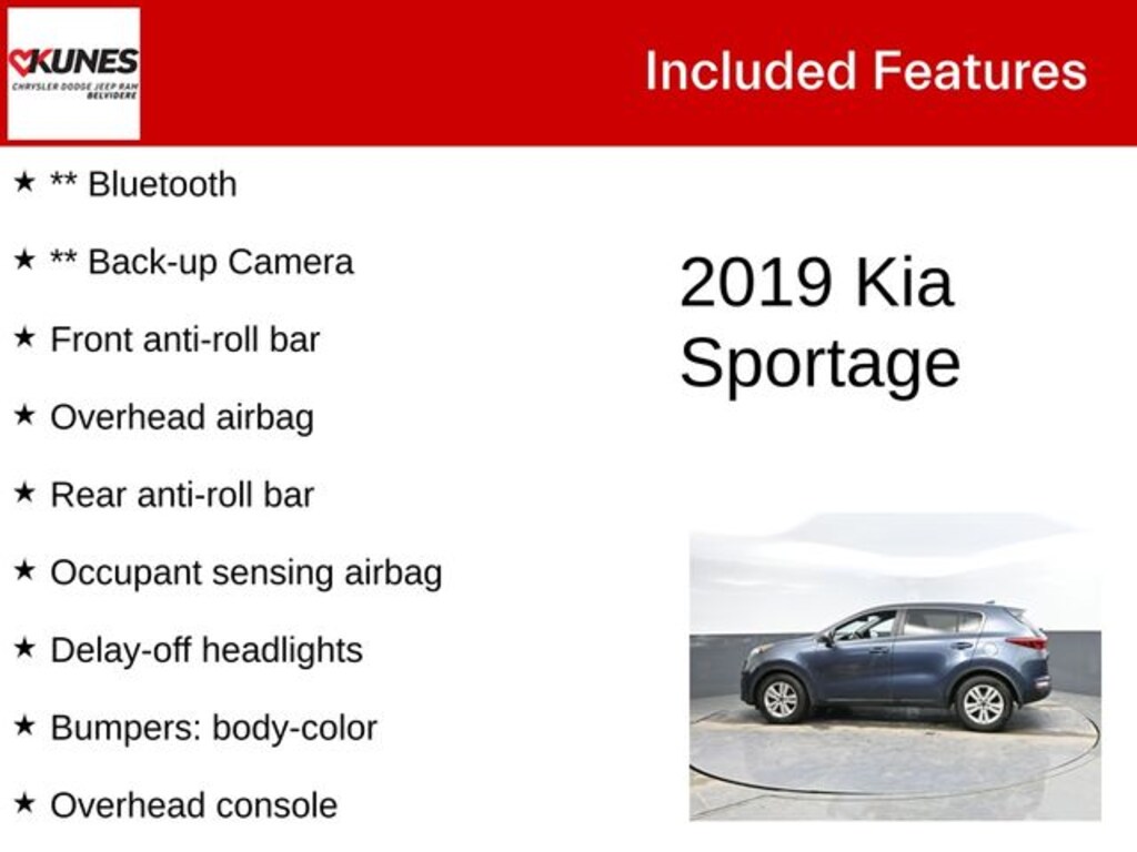 Recent Arrival! 2019 Kia Sportage LX FWD ** Bluetooth, ** Back-up Camera, 17" Alloy Wheels, Bumpers: body-color, Delay-off headlights, Front anti-roll bar, Front reading lights, Illuminated entry, Occupant sensing airbag, Overhead airbag, Overhead console, Rear anti-roll bar, Rear window wiper, Tachometer, Telescoping steering wheel.