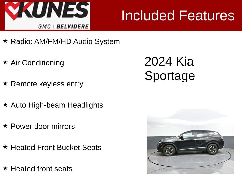 Recent Arrival! Certified. 2024 Kia Sportage LX LX Air Conditioning, Auto High-beam Headlights, Heated Front Bucket Seats, Heated front seats, Power door mirrors, Radio: AM/FM/HD Audio System, Remote keyless entry. Fusion BlackOpened with Kunes in June 2020 along with Kunes CDJR of Belvidere, Kunes Cadillac GMC of Belvidere allows us to have another location close to home for you to find your ideal Cadillac or GMC vehicle. Being so close to Rockford, IL means that we are at a convenient location for many Illinois as well as Wisconsin residents. Previously Kunes Country, Kunes Auto Group has stayed true to our values with our slogan of Faith, Family, and Giving Back. These four words embody what Kunes Auto Group is all about. We strive to build people's lives and we live up to that by employing over 2,000 people and donating 10% of our yearly net profits to charities in our communities. Our dedication to our employees, customers, and communities is shown through our countless Automotive Newsâ Best Dealerships to Work For awards that are given to 100 dealers nationwide every year. 23/26 City/Highway MPG Certification Program Details:** NO FEAR LIFETIME CERTIFIED PREOWNED **Over $2,895 of value at no cost!*LIFETIME WARRANTY!*3 Day Exchange Policy!*Complimentary powertrain warranty with ability to upgrade to fully comprehensive coverage and/or extend up to 125,000 miles!*125+ Point Inspection by our factory trained ASE Certified technicians and reconditioned to the highest standards.*Complimentary AutoCheck History Report*Complimentary AutoCheck Buyback Protection*Financing for Everyone - Guaranteed credit approval regardless of credit history!*Over 30 lenders who compete to get you the best financing terms*No payments for up to 90 days!*Weekly, Bi-Weekly, and Monthly Payment Options for all buyers!*First Free Oil Change!*Trade anytime policy - cars, trucks, boats, RVs, motorcycles - as long as we donât have to feed it, you can trade it! While we make every effort to ensure the data listed here is correct, there may be instances where some of the options or vehicle features may be listed incorrectly as we get data from multiple data sources. PLEASE MAKE SURE to confirm the details of this vehicle with the dealer to ensure its accuracy. Dealer cannot be held liable for data that is listed incorrectly. Prices shown do not include taxes, license, and title fees and a $367.70 documentary service fee.