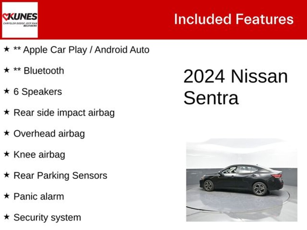 Recent Arrival! Certified. 2024 Nissan Sentra SV FWD ** Apple Car Play / Android Auto, ** Bluetooth, 6 Speakers, Knee airbag, Leather steering wheel, Overhead airbag, Panic alarm, Rear Parking Sensors, Rear side impact airbag, Security system, Technical Spec Change 2.