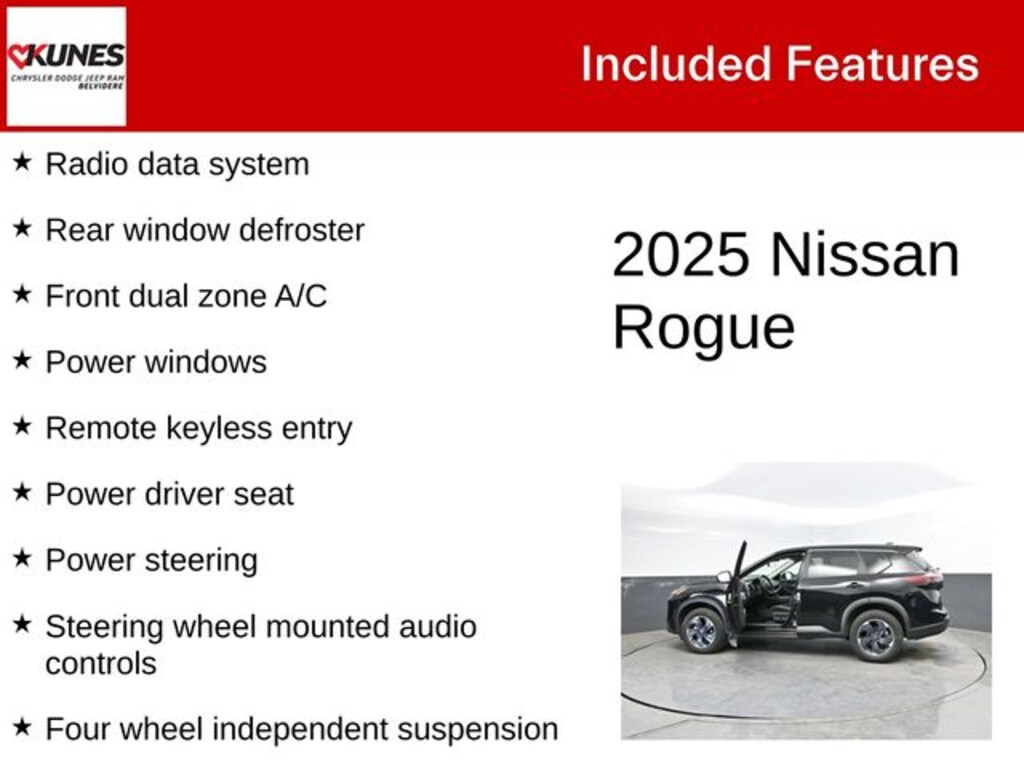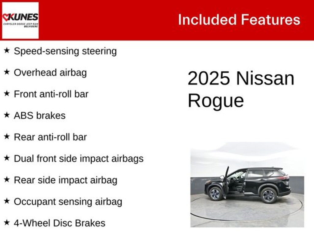 Recent Arrival! 2025 Nissan Rogue SV AWD 4-Wheel Disc Brakes, ABS brakes, Driver door bin, Driver vanity mirror, Dual front side impact airbags, Four wheel independent suspension, Front anti-roll bar, Front Bucket Seats with 8-Way Power Driver Seat, Front Center Armrest, Front dual zone A/C, Front reading lights, Illuminated entry, Occupant sensing airbag, Outside temperature display, Overhead airbag, Overhead console, Passenger door bin, Passenger vanity mirror, Power driver seat, Power Liftgate, Power steering, Power windows, Radio data system, Rear anti-roll bar, Rear seat center armrest, Rear side impact airbag, Rear window defroster, Remote keyless entry, Speed-sensing steering, Split folding rear seat, Spoiler, Steering wheel mounted audio controls, Tachometer, Telescoping steering wheel, Tilt steering wheel, Trip computer, Variably intermittent wipers.