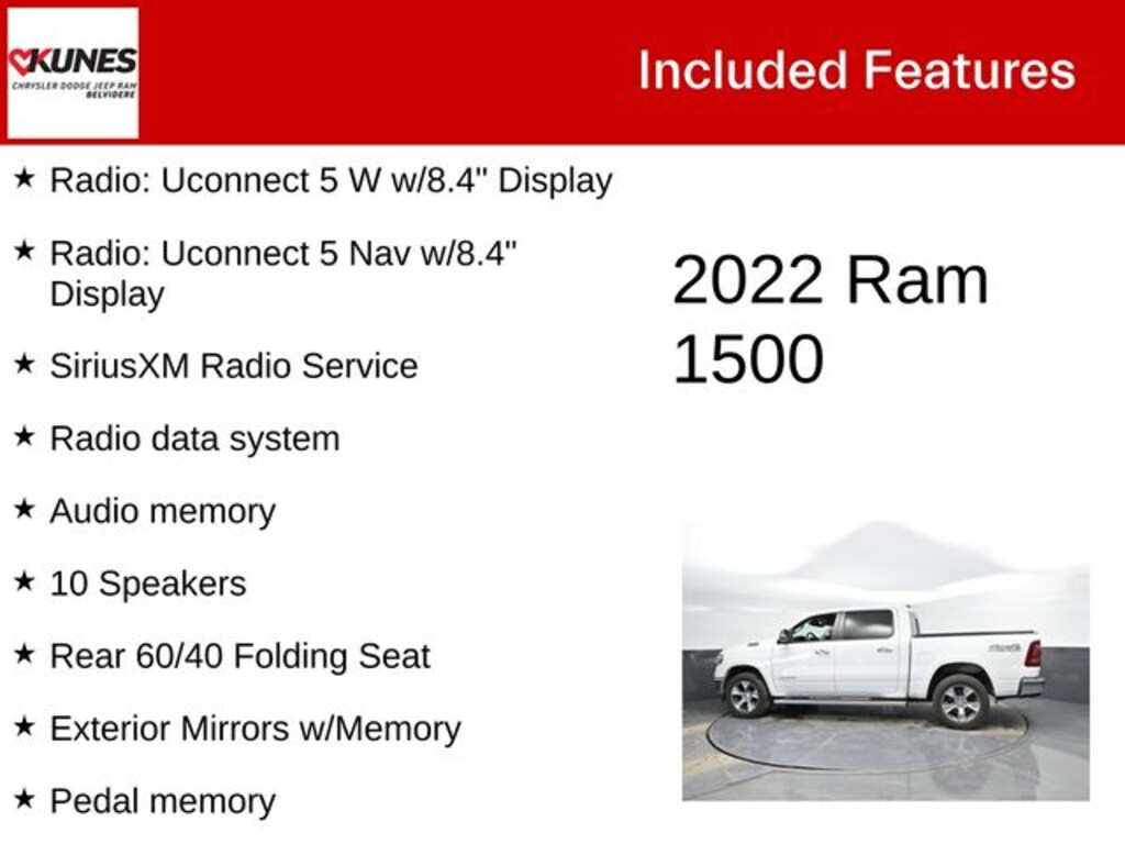 While we make every effort to ensure the data listed here is correct, there may be instances where some of the factory rebates, incentives, options or vehicle features may be listed incorrectly as we get data from multiple data sources. PLEASE MAKE SURE to confirm the details of this vehicle with the dealer to ensure its accuracy. Dealer cannot be held liable for data that is listed incorrectly. * MSRP is the Manufacturer's Suggested Retail Price (MSRP) of the vehicle. It does not include any tax, title, license or $377.63 documentary service fee. Consult the dealer for fees, payments and complete details. * Offers, incentives, discounts, or financing are subject to expiration and other restrictions. See dealer for qualifications and complete details. * In transit means that vehicles have been built but have not yet arrived at our dealership; images shown may not necessarily represent exact vehicles in transit to your dealership. See your dealer for complete details. Consumers, please be aware that the above advertised price assumes you are purchasing the vehicle from the Kunes Auto Group dealership where it is listed as being offered for sale. If the vehicle is transferred from one location to another, a transfer fee for this transportation of $300 will be added to the purchase transaction. If you would like to purchase such vehicle without paying a transfer fee, you can take delivery of the vehicle at the store it is listed as being sold from and avoid the additional transfer fee. Shipping fees vary depending on location, contact dealer for shipping details and costs. *Any MPG listed is based on model year EPA mileage ratings. Use for comparison purposes only. Your actual mileage will vary, depending on how you drive and maintain your vehicle, driving conditions, battery pack age/condition (hybrid only) and other factors. Max payload/towing estimate ratings shown. Additional options, equipment, passengers, and cargo weight may affect payload/towing weights. See dealer for details. * MSRP is the Manufacturer's Suggested Retail Price (MSRP) of the vehicle. It does not include any taxes, fees or other charges. Pricing and availability may vary based on a variety of factors, including options, dealer, specials, fees, and financing qualifications. Consult your dealer for actual price and complete details. Vehicles shown may have optional equipment at additional cost. *Pricing provided may vary significantly between website and dealer as a result of supply chain constraints. Pricing shown is non-binding and does not constitute an offer. Contact your dealer for updated vehicle pricing. * The estimated selling price that appears after calculating dealer offers is for informational purposes, only. You may not qualify for the offers, incentives, discounts, or financing. Offers, incentives, discounts, or financing are subject to expiration and other restrictions. See dealer for qualifications and complete details. * Images, prices, and options shown, including vehicle color, trim, options, pricing and other specifications are subject to availability, incentive offerings, current pricing and credit worthiness. * Max payload/towing estimate ratings shown. Additional options, equipment, passengers, and cargo weight may affect payload/towing weights. See dealer for details. * In transit means that vehicles have been built, but have not yet arrived at your dealer. Images shown may not necessarily represent identical vehicles in transit to your dealership. See your dealer for actual price, payments and complete details.